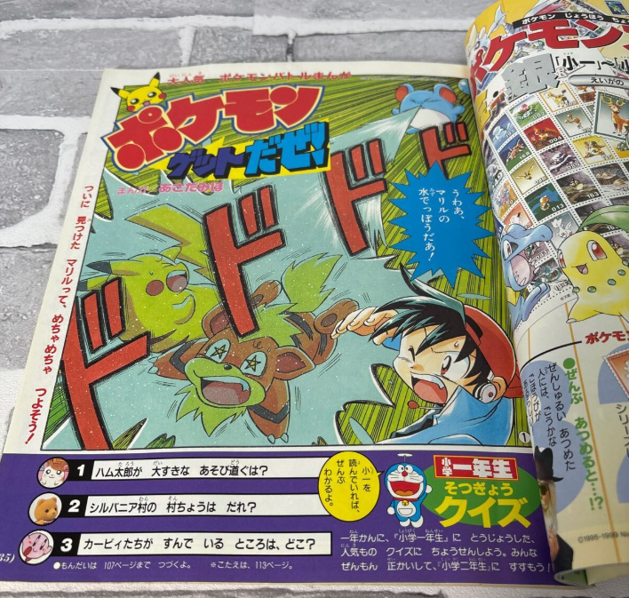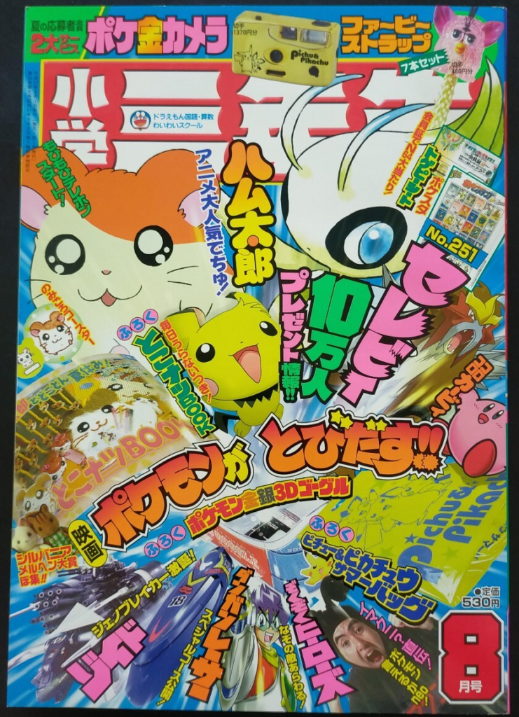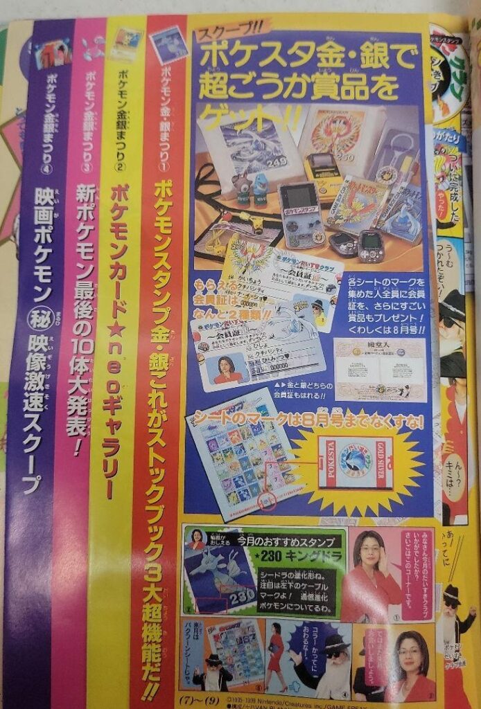 Here’s where the waters get a little muddied. It’s obvious that the Fan Club Chairman made a triumphant return to anchor the Gold & Silver Campaign, having skipped involvement in the G&S Pre-Sheets to enjoy a well-deserved tropical sabbatical shilling spin-off “stamp badges”.2Stamp-shaped pins, essentially. We know for a fact that March 2000, Year 1 included an introduction to the upcoming stamp campaign because a Yahoo Auction image shows a sliver of such a page (here). I’m positive that elaborate introductions were crafted for all of the grade-years but since the Japanese magazine resellers on whom we rely for supporting images instead appear to be laser-focussed on stamp sheets themselves – and who can blame them – we don’t have much to go off. So what do we have?