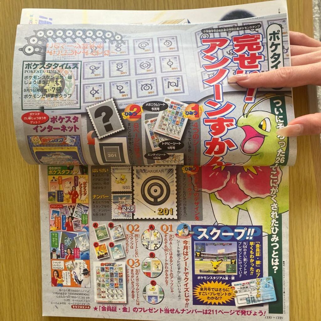 To shepherd GSLM’s school-age readership through the meandering Gold & Silver campaign, each monthly issue of at least certain grade-years incorporated a “POKESTA TIMES” portion.7「ポケスタタイムズ」Only Year 2 is confirmed at this point. Which was, in plain English, a colourful one or two-pager filled with interactive content and engaging deep-dive information about the goings-on in stampland. GSLM September 2000, Yr2 its “PokeSta Vol.6” for example impressed readers with factoids about that month’s Entei/Unown Movie2000 sheet as well as pitching the Top (?) Confectionary G&S cross-promotional sheets (see below). PokeSta Vol.7 in October 2000, Yr2, on the other hand, taught readers various stamp sheet “secrets” and quizzed them on that month’s Meganium sheet. In this manner, Shogakukan attempted to turn Gold & Silver into an experience richer than the mere cutting and pasting of stamps into a stockbook for the now fifth time (after Original, Blue, Complete, and Stadium).