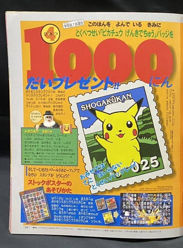 Still, as the first ever Colosseum-style Pokémon brawler, Stadium 1 made a considerable splash in Japan. It’s hard to imagine now, but to a generation of Pokéfans, watching their favourite creatures animate attacks in three dimensions was an “overwhelming”, even formative moment.3See also this retrospective on Famitsu: https://web.archive.org/web/20250123013618/https://www.famitsu.com/article/202408/12478 Quite understandably, Stadium 1’s groundbreaking novelty made the game an attractive target for publishing house Shogakukan to latch onto and anchor yet another of its beloved Pokéstamp campaigns. So naturally, they did.