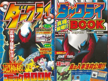 Per CoroCoro’s April issue, Darkrai now featured prominently on the magazine cover – a spot wouldn’t cede for four straight volumes (April – July). It moreover came with the aforementioned bite-sized “top secret” (超極秘) Darkrai comic book that held – you guessed it – a short manga all about the Phantom Pokémon as well as disclosing further specifics about Darkrai’s unparalleled power in the games. CoroCoro’s June issue, for its part, arrived with a miniature “Darkrai Perfect Guide Book” (ダークライ真相解明BOOK”) that restated much of Darkrai’s unique traits, offered information about 10th Deoxys, served up a Dialga vs. Palkia monster battle comic that anticipated scenes from the upcoming film, and last but not least, seriously hinted at GameFreak’s digital Darkrai distribution plans. CoroCoro’s May and June issue covers indicate another central role for Darkrai in those primary mags as well, though I’ve not been able to locate relevant scans. Taken together, CoroCoro printed an incredible amount of advertising for 2007’s film, and much of it placed key protagonist Darkrai centre stage.